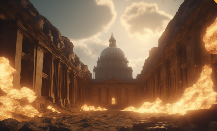 Blinding, golden, furious light that splits the sky open like it’s made of paper. Wind howls through stone corridors, ancient and unyielding, carrying the smell of dust and something metallic.