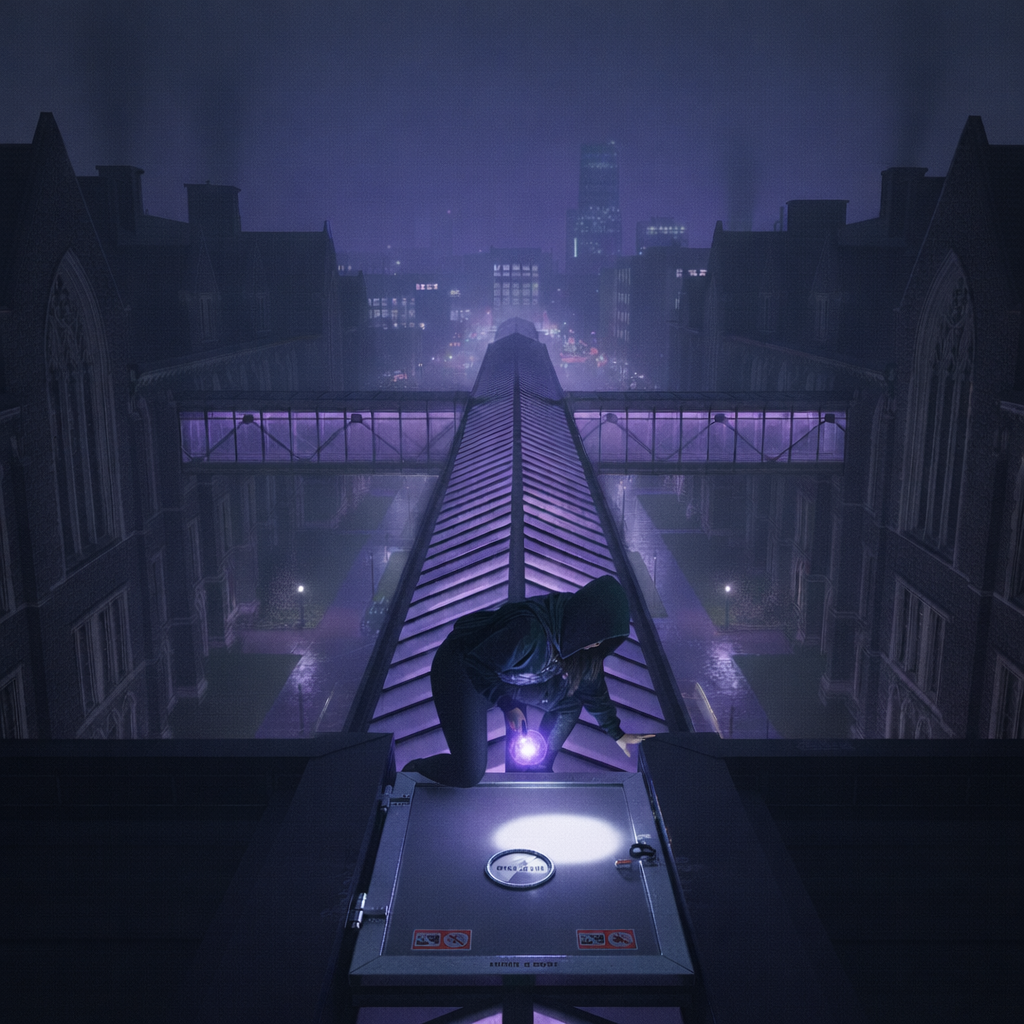 Campus spreads below in pools of amber light. Empty pathways. Locked buildings. The Archive sits at the far edge, all sharp angles and reinforced glass, looking exactly like what it is: a place designed to keep secrets.